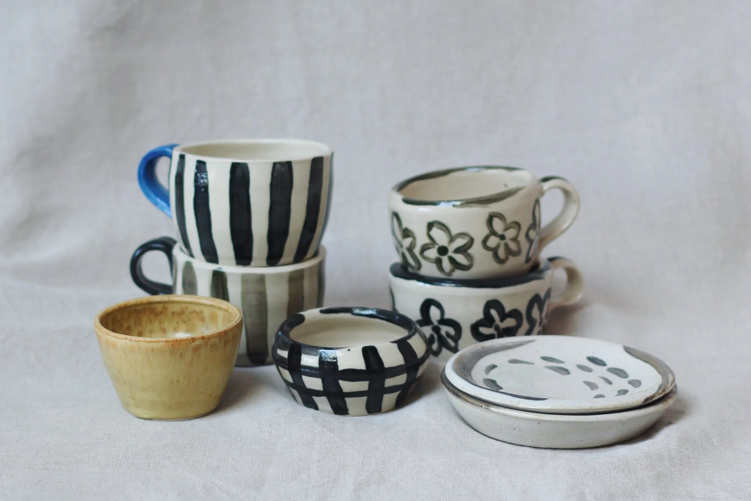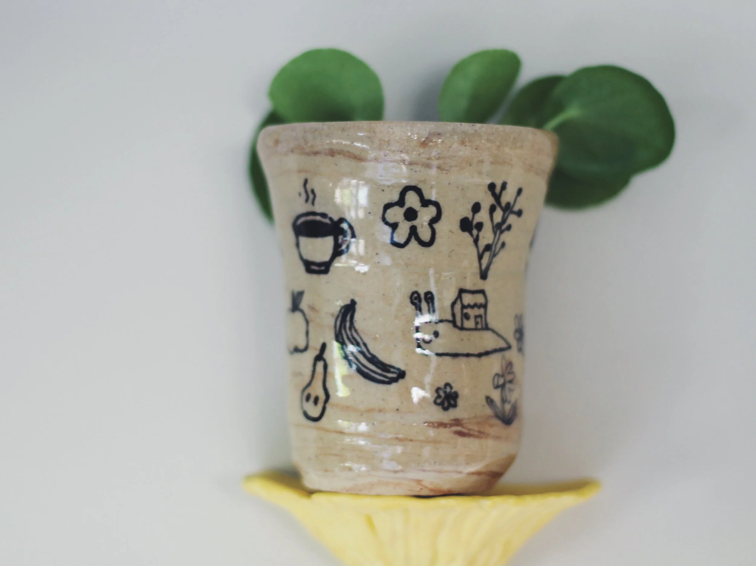 A little cup with doodles I made from pottery, currently housing my pilea plant